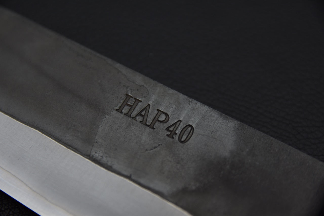 When HAP 40 first became available, Osamu Yoshida quickly bought the steel and tried it out. He was amazed at how incredibly sharp the steel could become and how long it would hold its edge, so he began making kitchen knives using this super steel. Although it is a difficult steel to handle, he feels a great sense of accomplishment when he forges with it compared to other steels.
