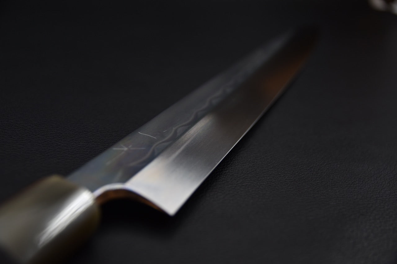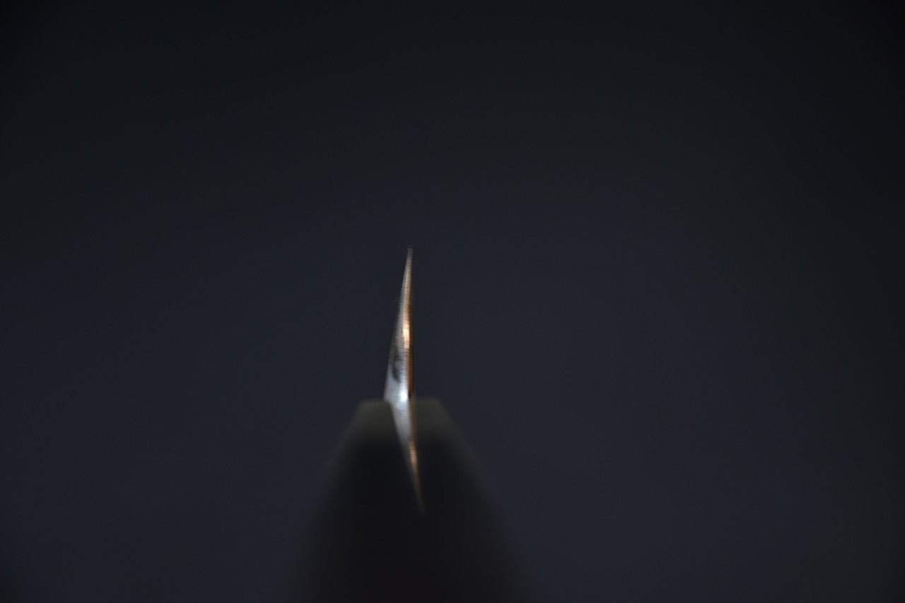 Yanagiba translates as “willow blade” since the narrow, long and curved blade shape on the back side resembles a willow leaf. The specialty of the Yanagiba is slicing fish in a precise and clean way for cutting sashimi or nigiri for example. It can also be used for filleting certain fishes and slicing meat. The very fine cutting edge can be damaged easily, so we advise you to be careful with bones. The concave back of the knife (urusaki) creates an air gap between the fish flesh and the blade, making it easy to detach the blade from the fish flesh, while the bevel on the face of the knife (shinogi) makes it easy to detach the piece of fish being sliced. The Yanagiba is generally found between 210 mm and 330 mm.