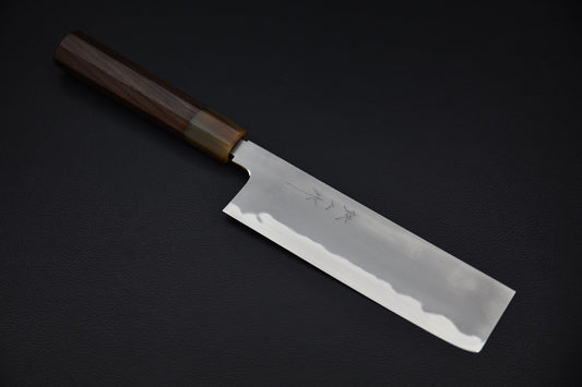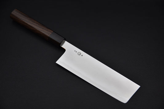The Nakiri knife has been specially designed to offer enhanced performance on all types of vegetables. Its wide, thin, and straight blade, sharpened on both sides, allows for clean cuts without rocking. This promotes a precise, linear cut, ideal for soft-fleshed vegetables like tomatoes, but also for denser foods such as sweet potatoes or daikon radish. Its flat geometry ensures a cut with full contact of the length of the blade against the board, which helps preserve the texture of the food, without damaging the fibers. Some chefs note that the fineness of the edge helps reduce oxidation of raw vegetables, thus preserving their visual appearance and freshness for longer. At Stay Sharp, we select Nakiri knives forged by renowned Japanese craftsmen, combining aesthetics, comfort, and performance.