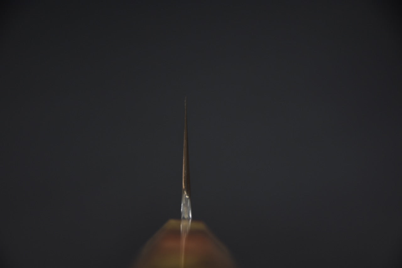 When using the Gyuto, it is crucial to ensure that the blade is perfectly straight upon impact with the cutting board. This helps prevent damage to the knife's edge, ensuring a precise and even cut while preserving the blade's durability. An incorrect impact angle can cause damage to the blade and affect the quality of the cuts. The Gyuto blade is made of high-quality Japanese steel, which gives it exceptional sharpness and high wear resistance. The steels used in the manufacture of Gyuto knives are heat-treated to high levels, allowing them to maintain their edge for a longer period of time compared to other types of knives. To extend the life of the Gyuto and maintain its sharpness, we recommend sharpening it regularly with a quality ceramic steel or using the leather block. As for sharpening on a stone, we recommend doing this once or twice a year for non-professional use. Sharpening on a stone must be done with care and precision, respecting the angle of the blade and following the proper techniques. If you prefer, we can take care of this through our expert sharpening service. If your Gyuto is made from rust-resistant steel, it is essential to take care to clean and dry the blade properly after each use to prevent rust and other moisture-related damage. If your knife is made of stainless steel, we still advise you to take care of it and not put it in the dishwasher, for example.