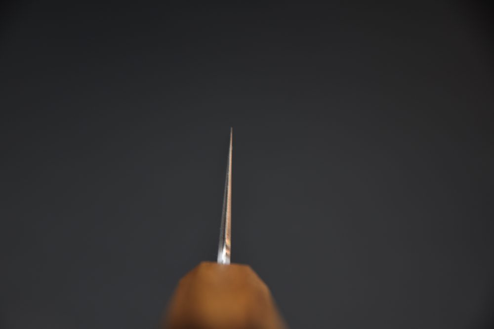 Hado's Sumi series is forged from Shirogami 2(number 2 white steel) by Master Blacksmith Yoshikazu Tanaka and honed by Tadataka Maruyama of Fukui Co & Ltd. Covered with oxidizable soft iron steel and sporting a beautiful kurouchi finish, the Sumi series will appeal to the more traditionalist among us who can appreciate the aspects of a full carbon blade. Built with a higher blade height, the Sumi series stands out from other Hado series. Coupled with Tadataka's concave grinding that gives a very thin edge, these blades can be described as laser-like. We recommend this series to professional cooks who have experience with full carbon blades, to traditional japanese knife enthusiasts and to anyone who is ready to make the leap into the world of carbon knives.