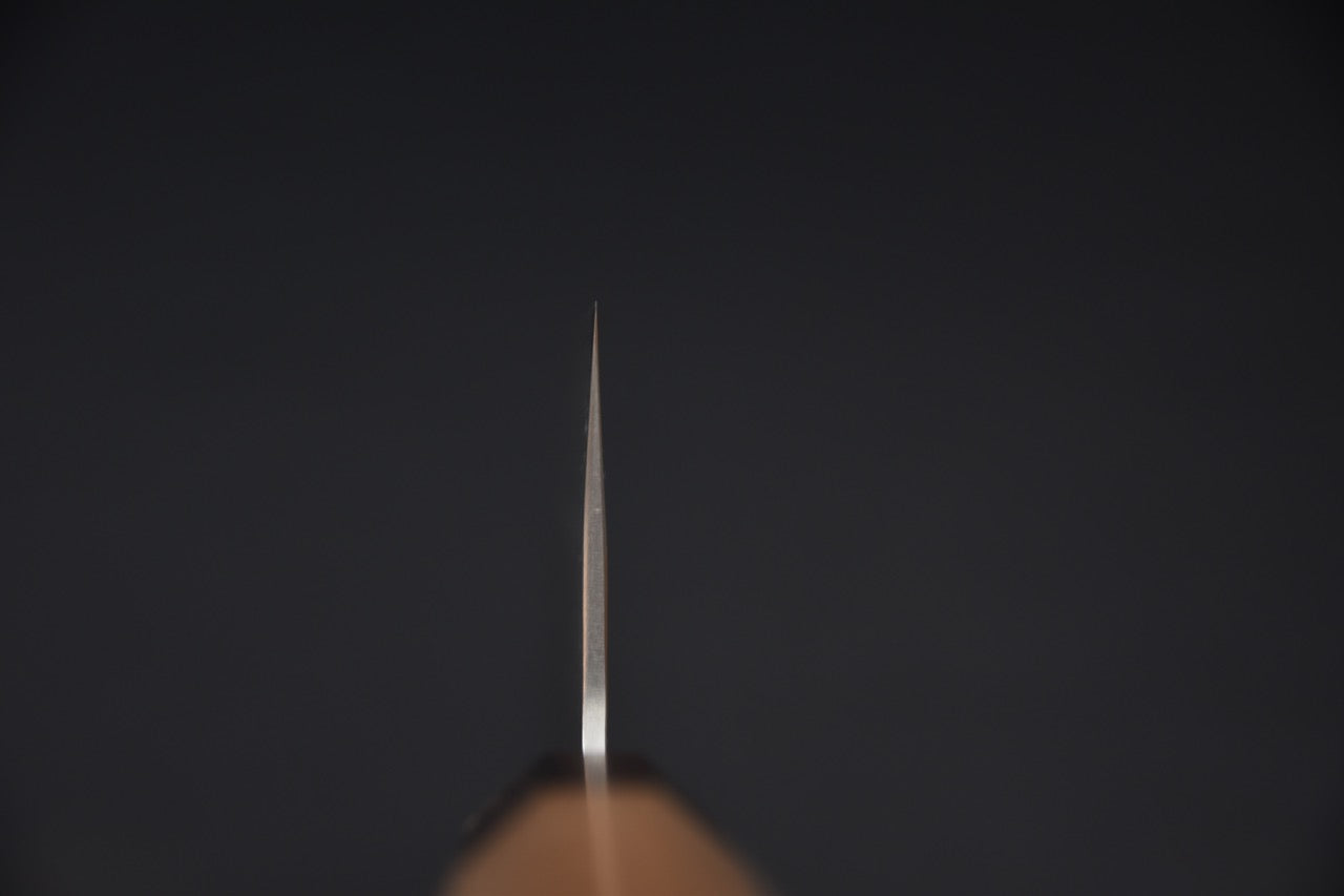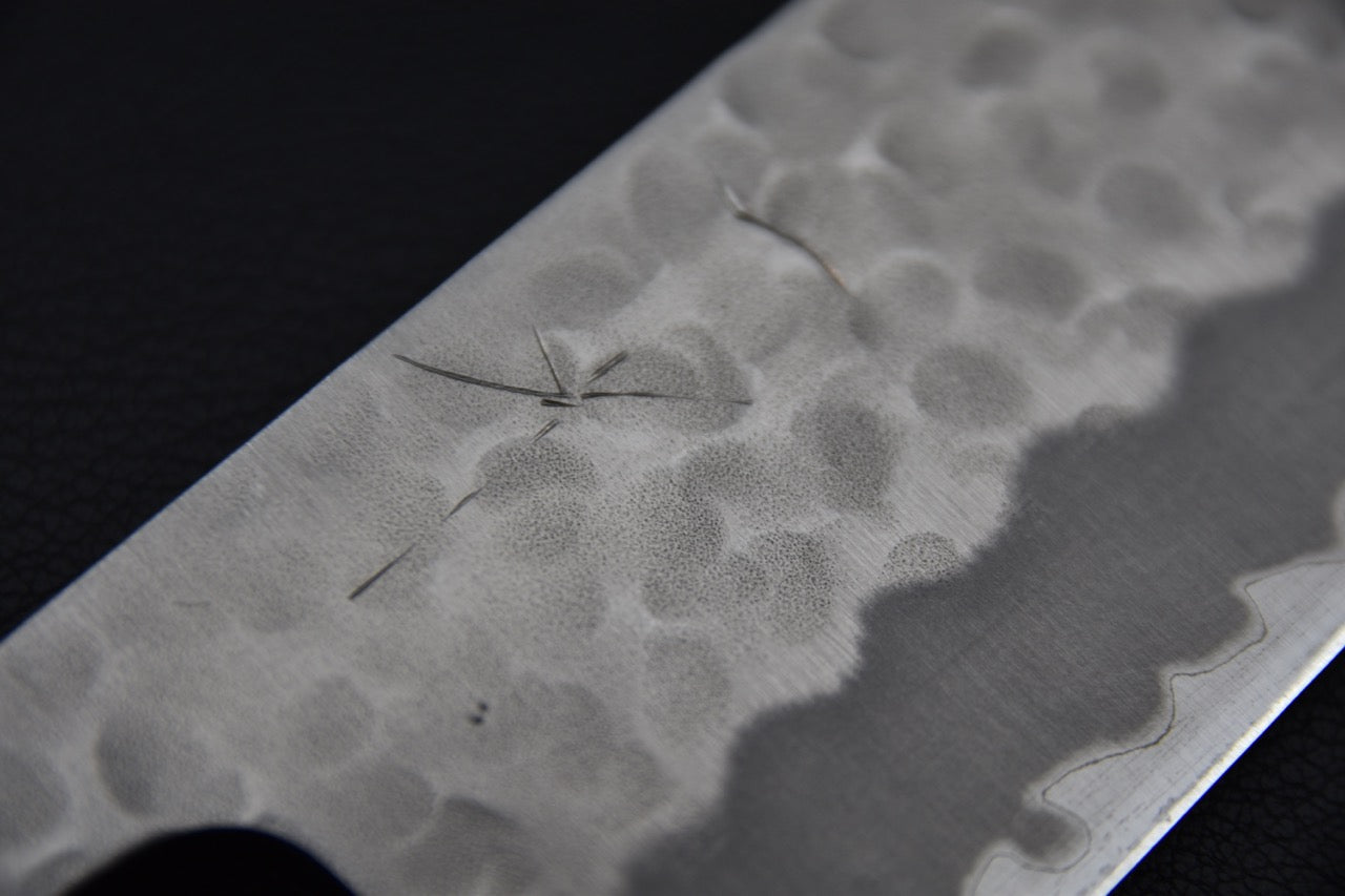 Shirogami #2 translates to: Shiro (white) and Gami (Steel) and thus; white steel #2. It is named after the color of the package it was wrapped in at Hitachi Metals. The composition of this steel is very pure and contains almost only iron and carbon (1.05%-1.2%). It is in the hands of very experienced blacksmiths that one realizes the enormous potential of Shirogami #2. The quality of the heat treatment and a lower temperature forging are key elements that can allow Shirogami #2 to compete with and even surpass many modern steels. Try a Shiro #2 blade forged by Tanaka-san, Kisuke Manaka-san or Yoshikane Forge and you will see!