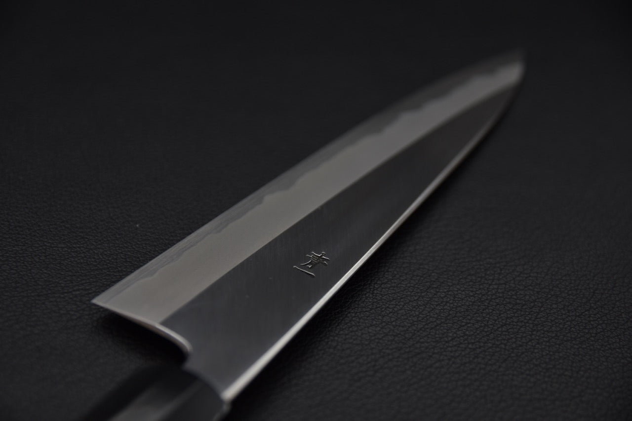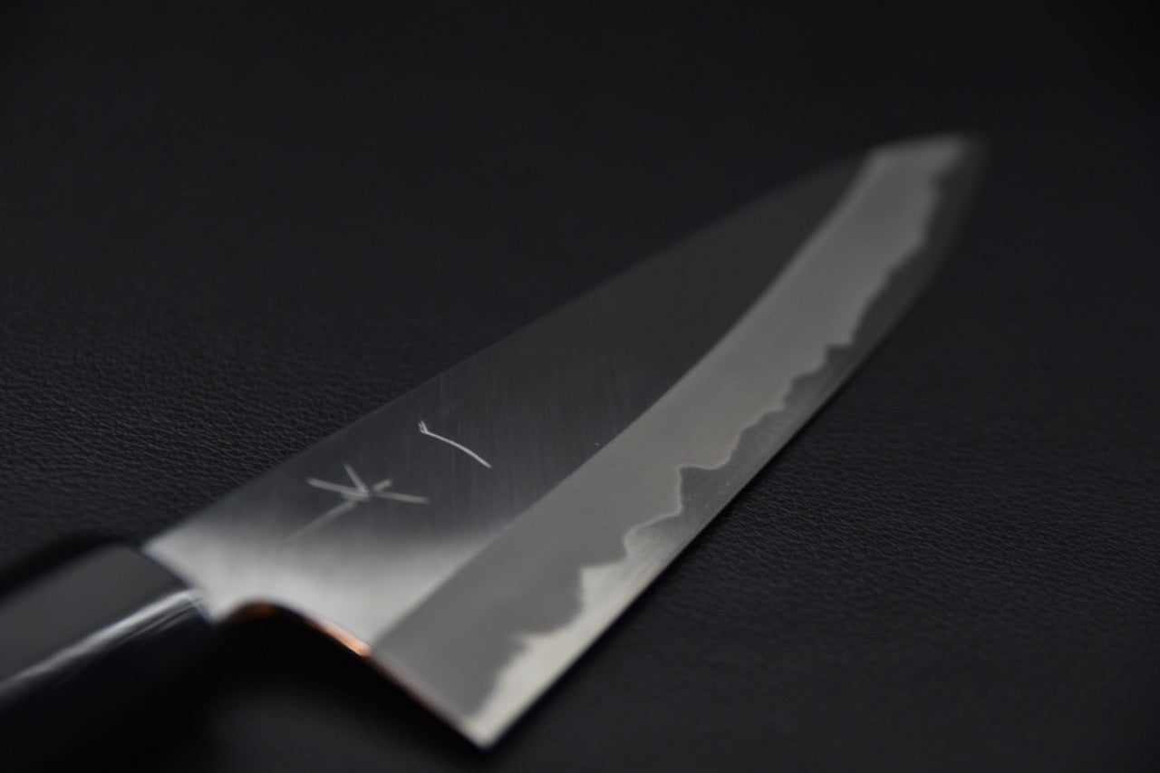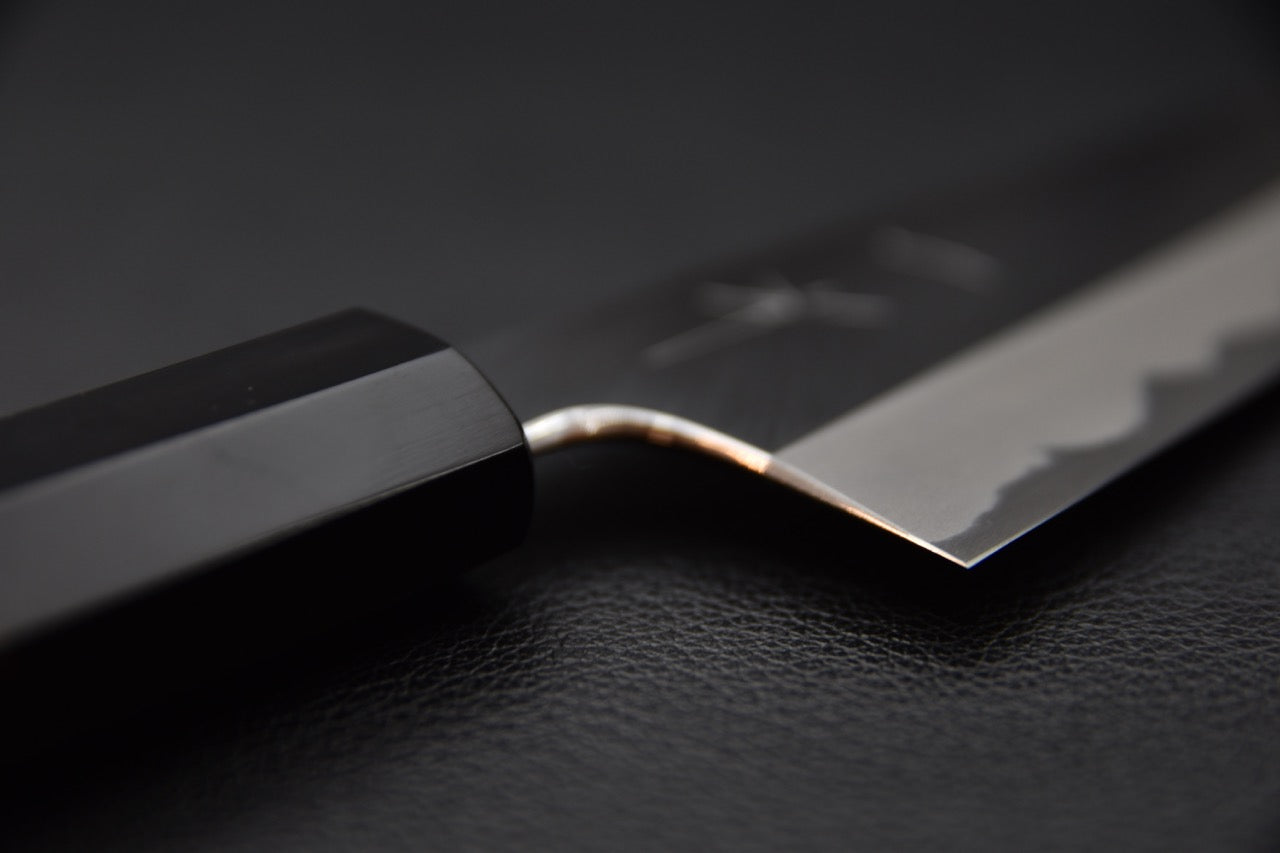 The Hitohira Tanaka Kyuzo Petty 165mm is a refined and compact Japanese knife forged by Kyuzo Tanaka using Aogami #1 steel. With its elegant Migaki (polished) finish and distinctive hamon line, this knife blends traditional craftsmanship with performance and style.