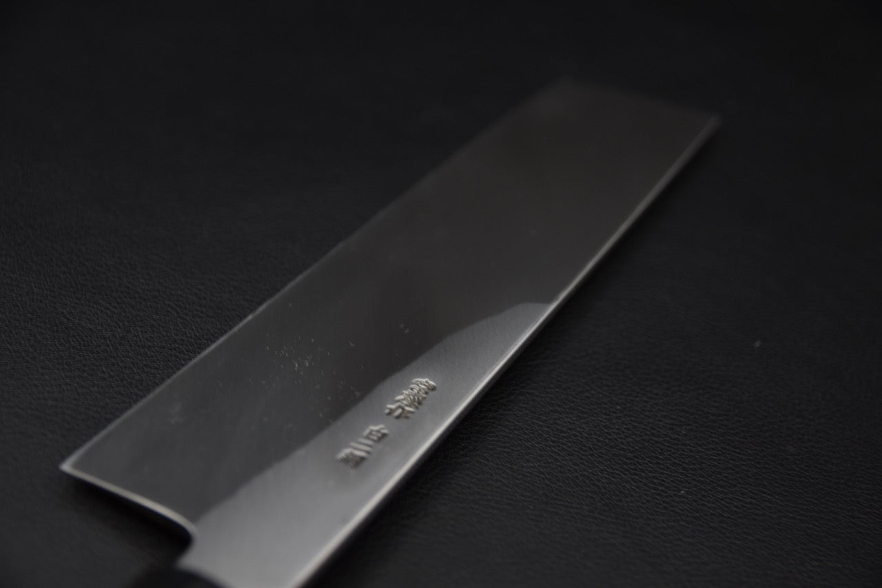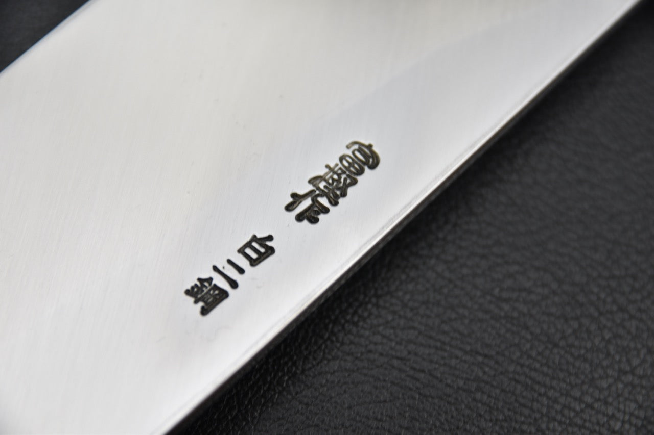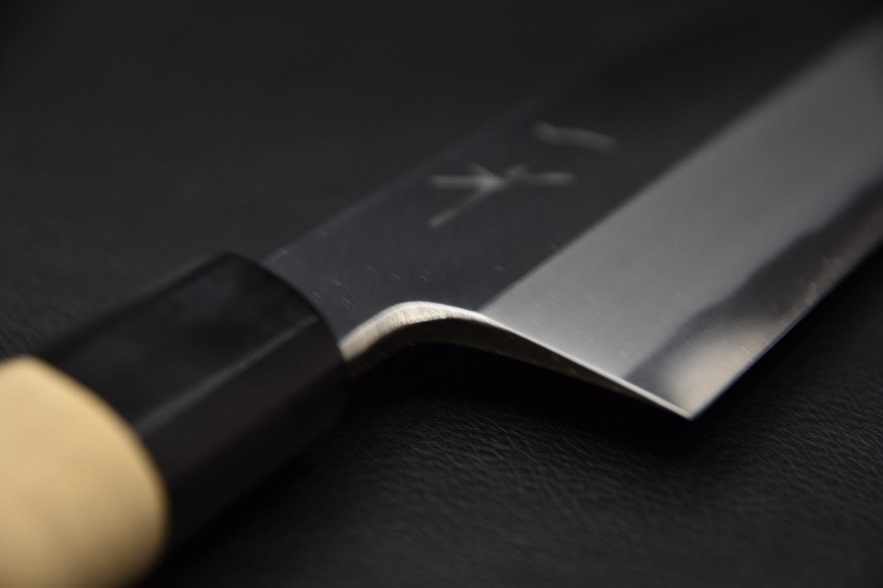 Like all Japanese carbon steel knives, careful maintenance is required. It is recommended to wipe the blade regularly during use and dry it thoroughly after washing to prevent oxidation. A natural patina will appear over time and is part of the character of the knife.