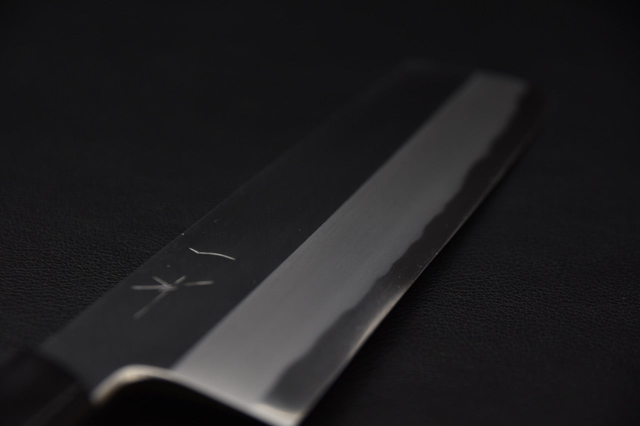 This 225 mm Japanese usuba knife from the Hitohira Togashi series is designed for precise vegetable preparation in the Japanese tradition. Forged by Kenji Togashi, it is made from Shirogami #2 carbon steel, renowned for its high purity, ease of sharpening, and excellent cutting potential. The blade is constructed in sanmai, with a carbon steel core wrapped in soft iron, offering a good balance between performance and control.