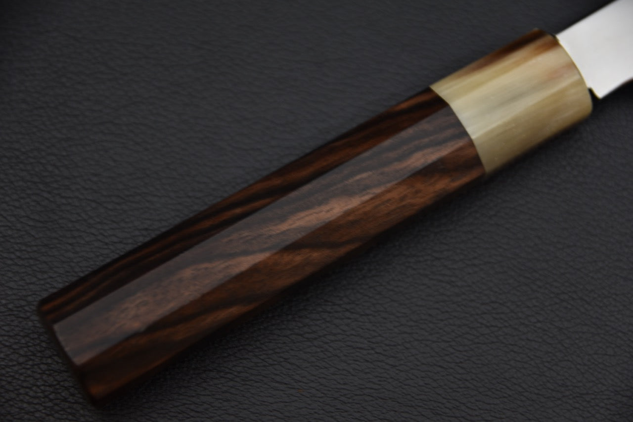 The ebony handle offers a naturally dense and refined grip, perfectly complementing the clean, minimalist lines of the blade. Designed with expert craftsmanship, this knife is ideal for both culinary enthusiasts and professionals looking for a dependable, elegant companion in the kitchen.