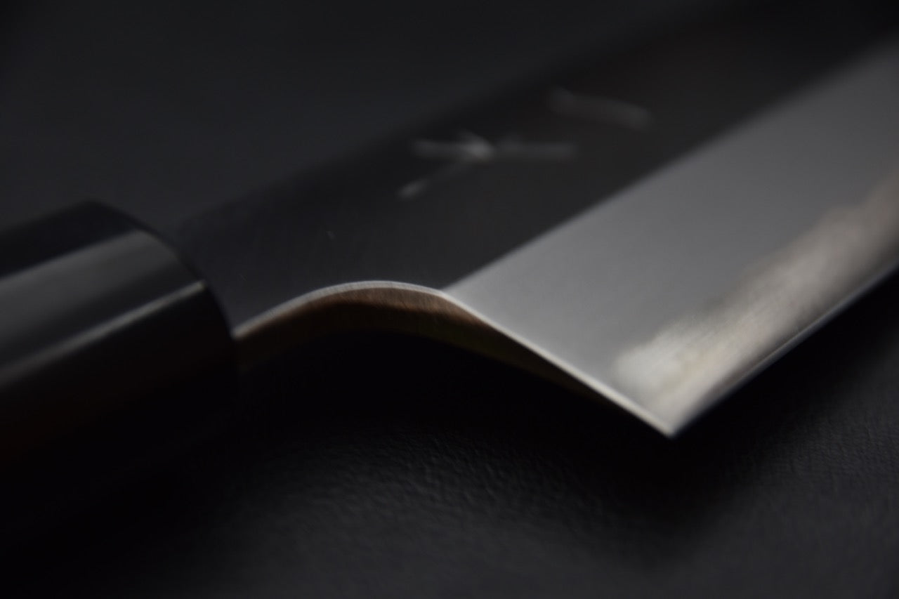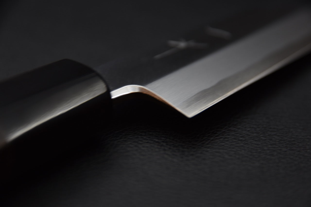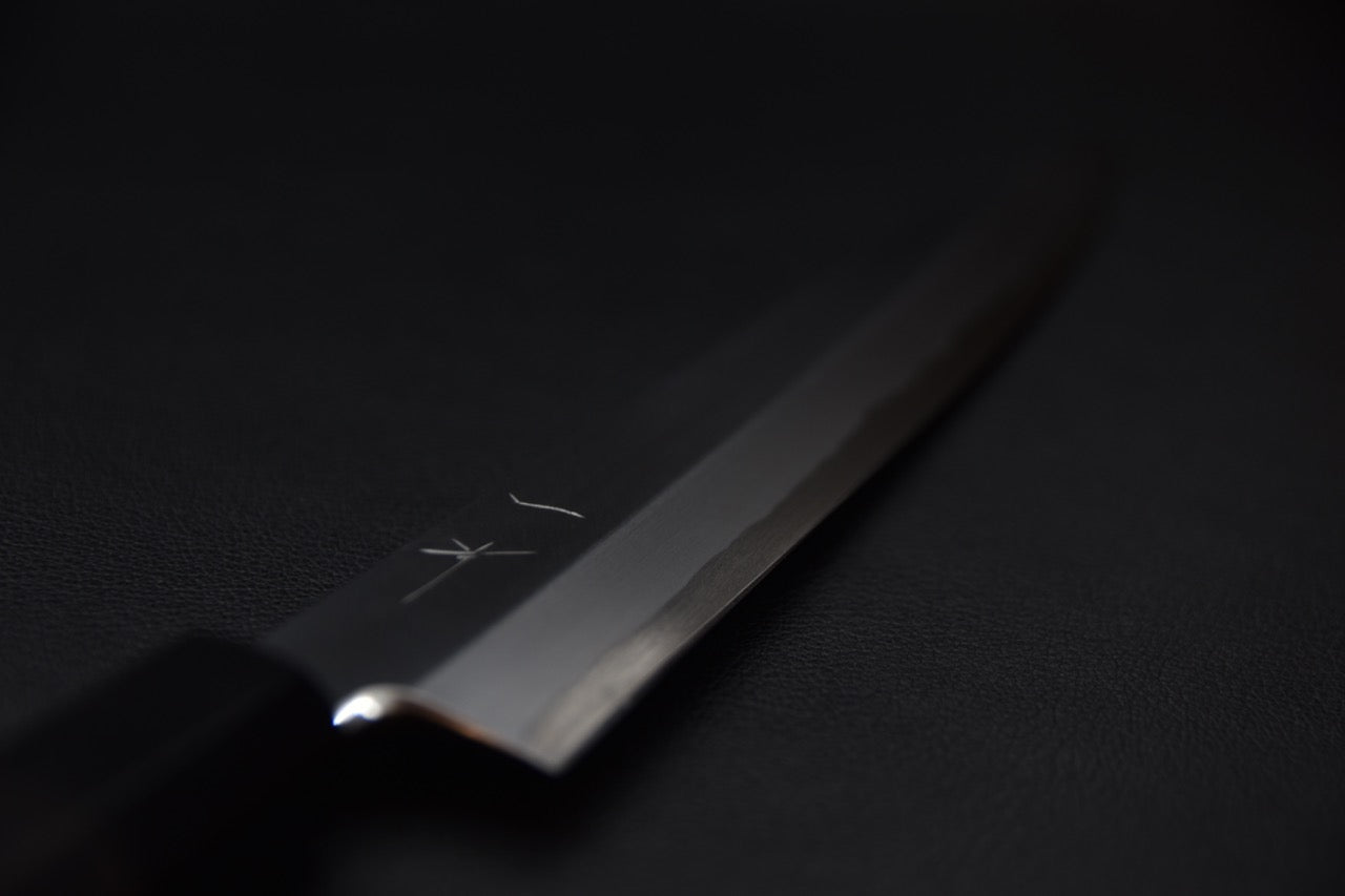 This 270 mm yanagiba embodies the mastery of the art of Japanese cutting. Its thin, straight, and long blade allows for elegant and precise cutting, ideal for sashimi or delicate fillets. The octagonal, tapered ebony handle ensures a stable and comfortable grip, reducing fatigue during repeated movements. The subtle balance of the whole knife gives a real feeling of mastery, with each stroke of the blade responding fluidly, effortlessly delivering a fine cut.