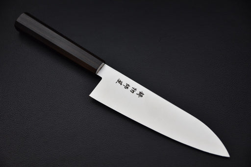 Couteau japonais Santoku 180mm Hitohira Imojiya Kuma en acier Aogami #2, vue complète sur fond noir.