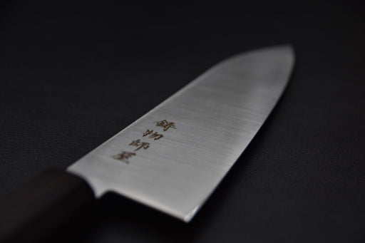 Détail de la lame satinée du couteau japonais Santoku Hitohira Imojiya TH Stainless avec kanji gravés.