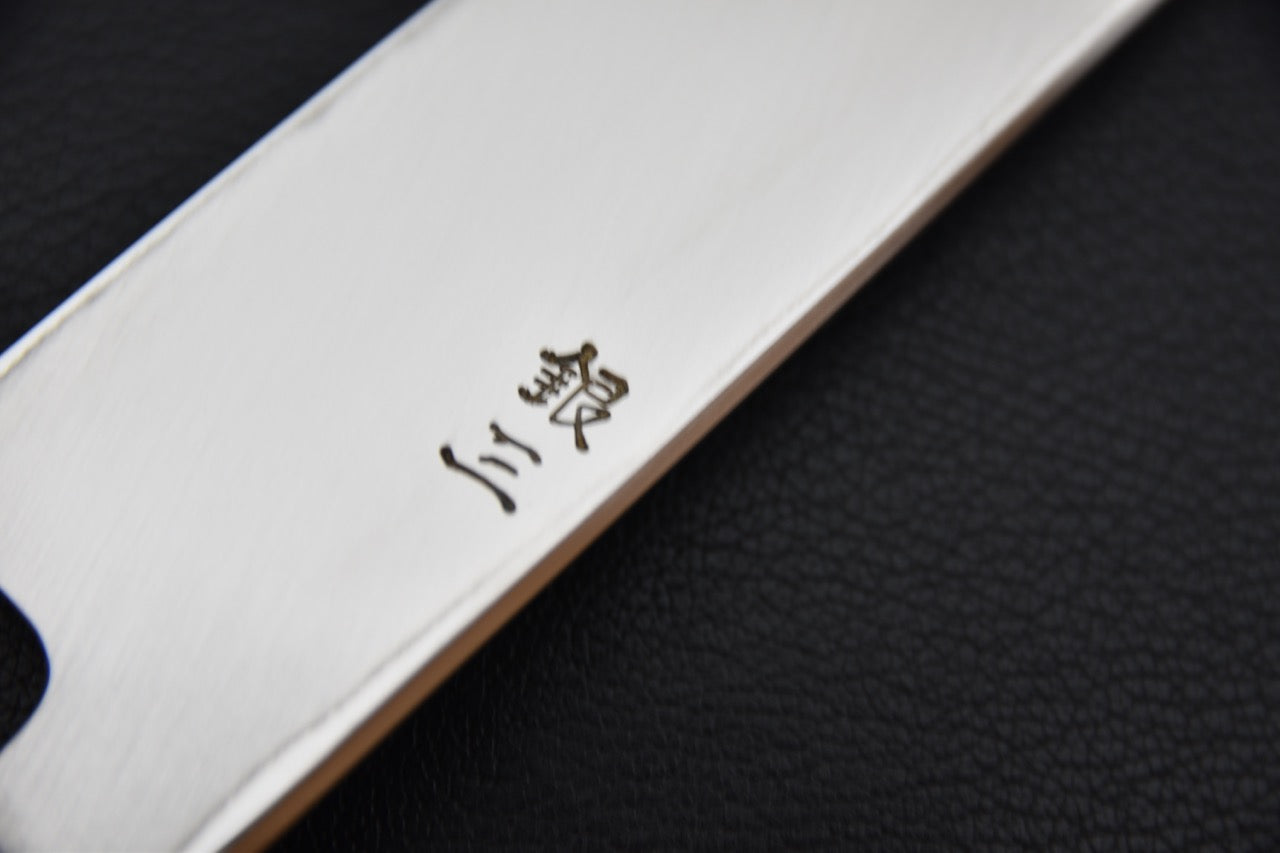 Kikuchiyo, the celebrated blacksmith from Sakai, Osaka, rose to prominence in the early 2000s when he was invited to join Sakai's master craftsmen. His early start in blacksmithing allowed him to amass extensive knowledge and skills before physical limitations set in. Notably, Kikuchiyo boldly experimented with unconventional steels like stainless, resulting in his Ginsan (Silver 3) knives becoming highly coveted among Japanese chefs. His expertise extended to Honyaki quenching, producing beautiful Hamon patterns and achieving the ideal hardness and consistance. Kikuchiyo's knives gained the respect of Sakai's sharpeners and finishers, and he remains dedicated to his dream of success, paying homage to his master's forge in every blade he forges.