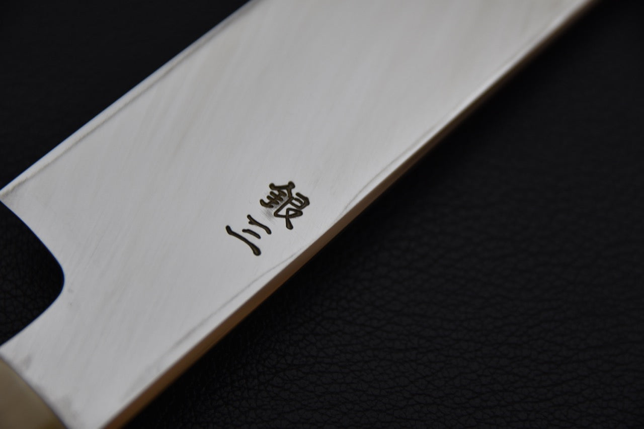 The Hitohira Kikuchiyo Mosuke Ginsan Yanagiba knife offers exceptional performance. It is hand-forged by Kikuchiyo and precisely ground by master Mosuke. Made from stainless Ginsan steel, it produces perfect cuts and is the ideal tool for slicing the delicate flesh of fish. With a length of 270 mm, it is the ideal tool for all professional chefs and passionate amateurs.