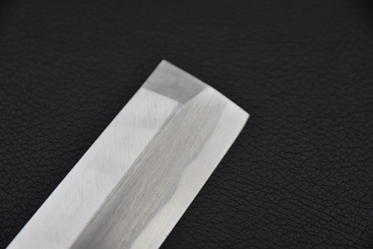 The Yanagiba's distinctive design has a few notable features. The back of the knife, called the urusaki, is concave, creating an air space between the blade and the fish. This makes it easier to separate the blade from the flesh, ensuring smooth, even slices. Meanwhile, the bevel on the knife's face, called the shinogi, allows for easy separation of the cut fish. These distinctive features contribute to the Yanagiba's efficiency and precision in its role as a specialized carving knife. Regarding dimensions, the Yanagiba knife is generally available in a length range of 210 mm to 330 mm. Selecting the appropriate size will depend on your personal preference and the size of the fish you plan to carve. Shorter versions are better suited for detailed tasks requiring great precision, while longer versions are more suitable for more extensive cuts.