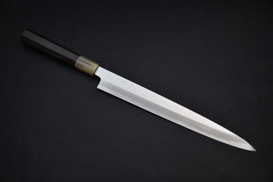 The Yanagiba knife is a traditional Japanese blade designed for the precise cutting of raw fish. Its name means "willow leaf," referring to its long, thin, and slightly curved shape reminiscent of this plant. This knife is primarily used for preparing sashimi and nigiri. Thanks to its edge sharpened on one side only (single bevel), it allows for long, clean cuts without damaging the fish flesh. This precision is essential for preserving the texture, freshness, and aesthetics of the slices. Unlike a double-beveled knife, the Yanagiba is designed to reduce cutting resistance and prevent tearing. At Stay Sharp, each Yanagiba knife is chosen for its handcrafted finish, perfect balance, and the quality of the steel used. It is intended for anyone wishing to enhance the presentation of their fish dishes with controlled gestures and a precision tool.
