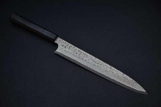 The Yanagiba knife is a traditional Japanese blade designed for the precise cutting of raw fish. Its name means "willow leaf," referring to its long, thin, and slightly curved shape reminiscent of this plant. This knife is primarily used for preparing sashimi and nigiri. Thanks to its edge sharpened on one side only (single bevel), it allows for long, clean cuts without damaging the fish flesh. This precision is essential for preserving the texture, freshness, and aesthetics of the slices. Unlike a double-beveled knife, the Yanagiba is designed to reduce cutting resistance and prevent tearing. At Stay Sharp, each Yanagiba knife is chosen for its handcrafted finish, perfect balance, and the quality of the steel used. It is intended for anyone wishing to enhance the presentation of their fish dishes with controlled gestures and a precision tool.