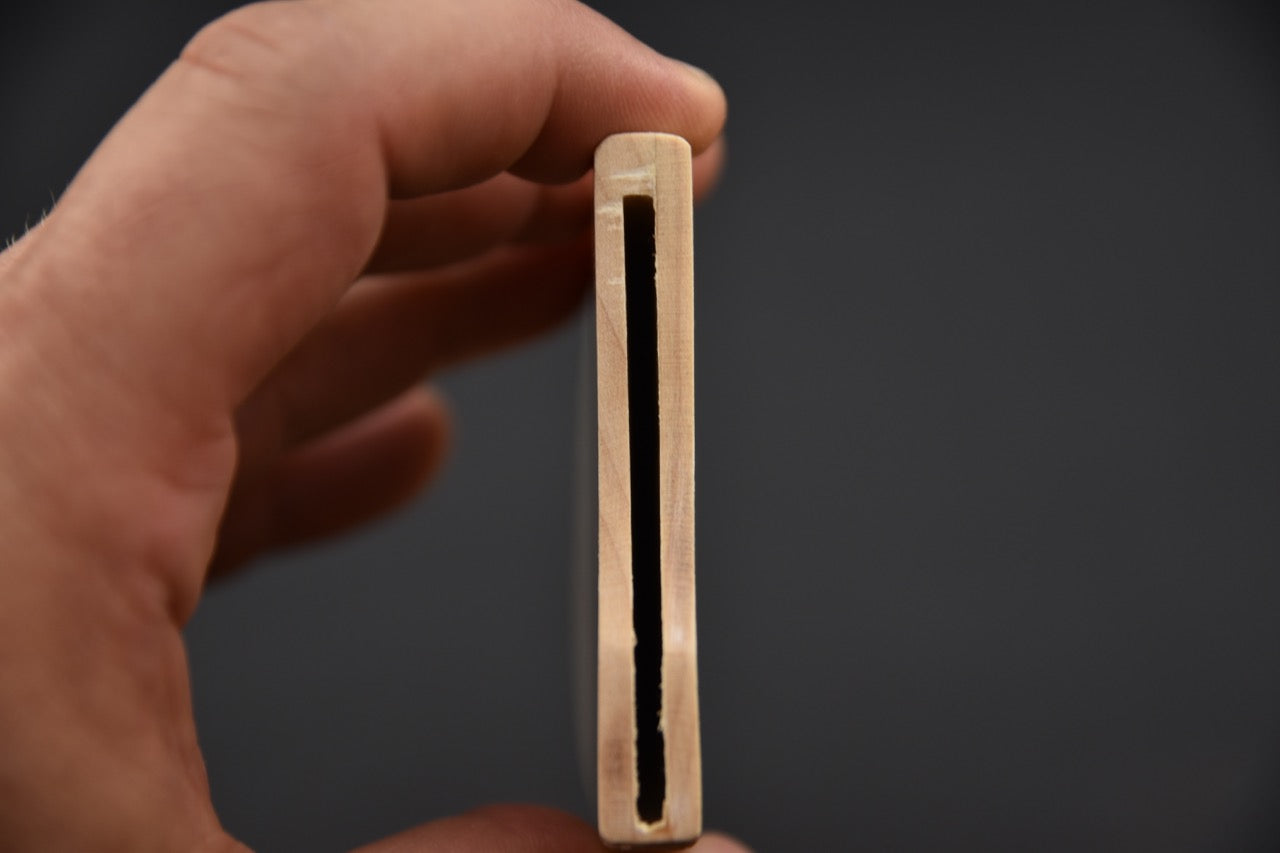 Give your Japanese Santoku knife tailor-made protection with this saya handcrafted in Quebec City by Bruno Barr. Carved from fine-grained maple, this saya combines natural elegance with sturdiness. Its pale hue and delicate grain highlight the wood's aesthetic appeal without stealing the spotlight from the knife it protects.
