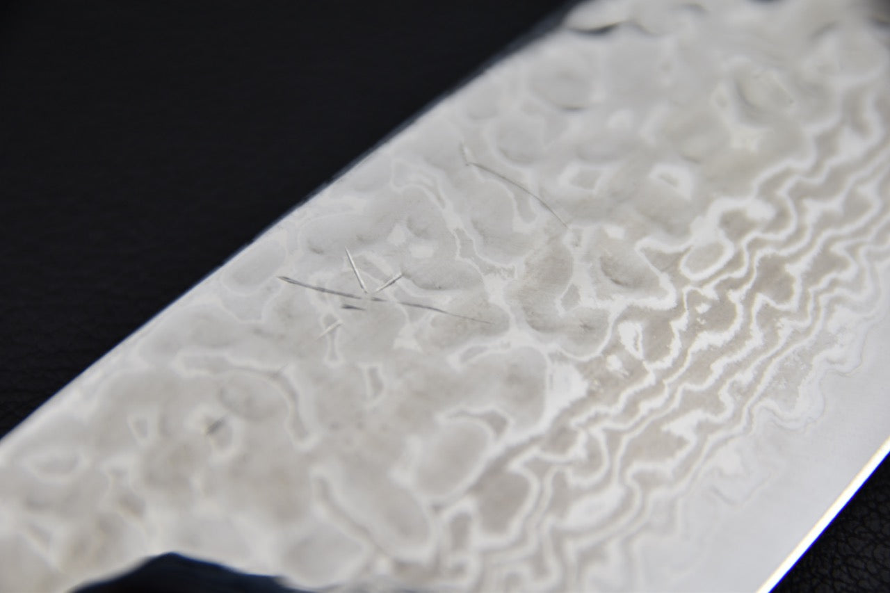 Its visual appeal is enhanced by a Damascus pattern and a traditional tsuchime (hammered) finish, which is both decorative and practical: it reduces food adhesion for smoother cuts. Every detail reflects the precision of Japanese craftsmanship, designed for control and ease of use.