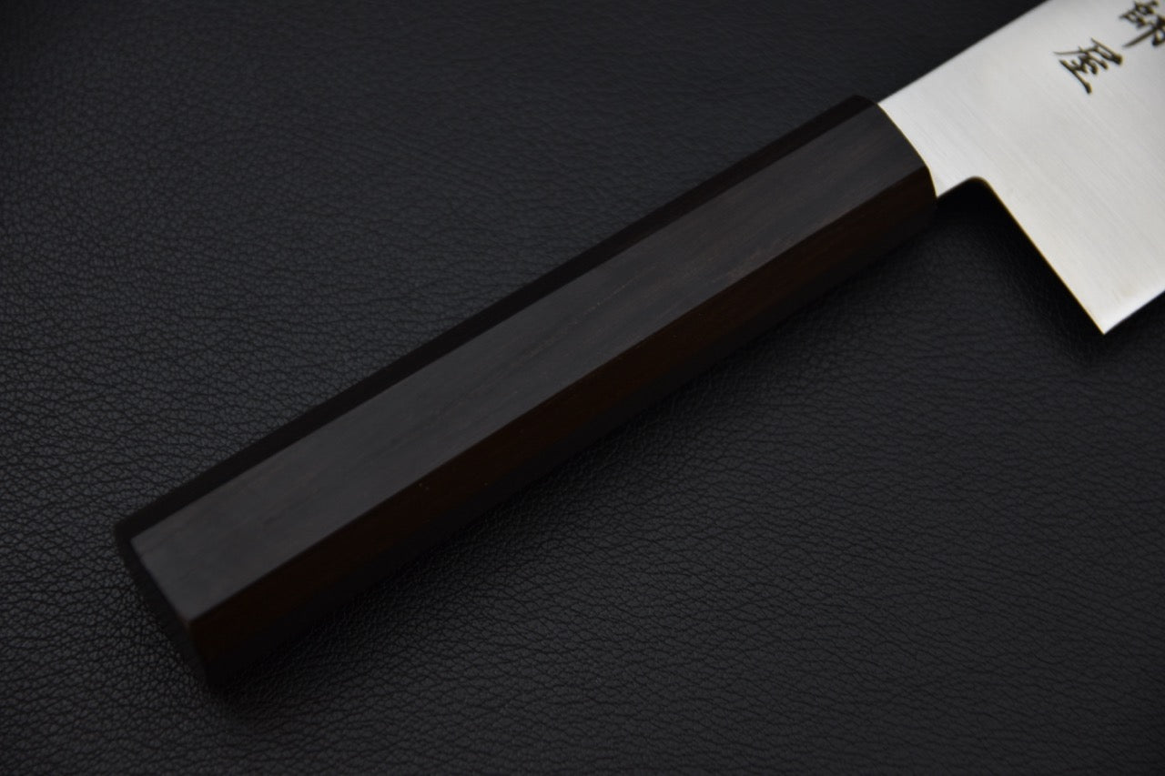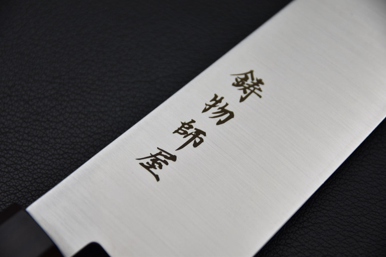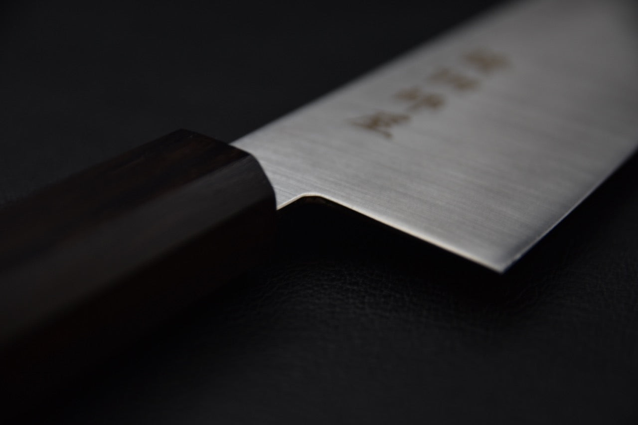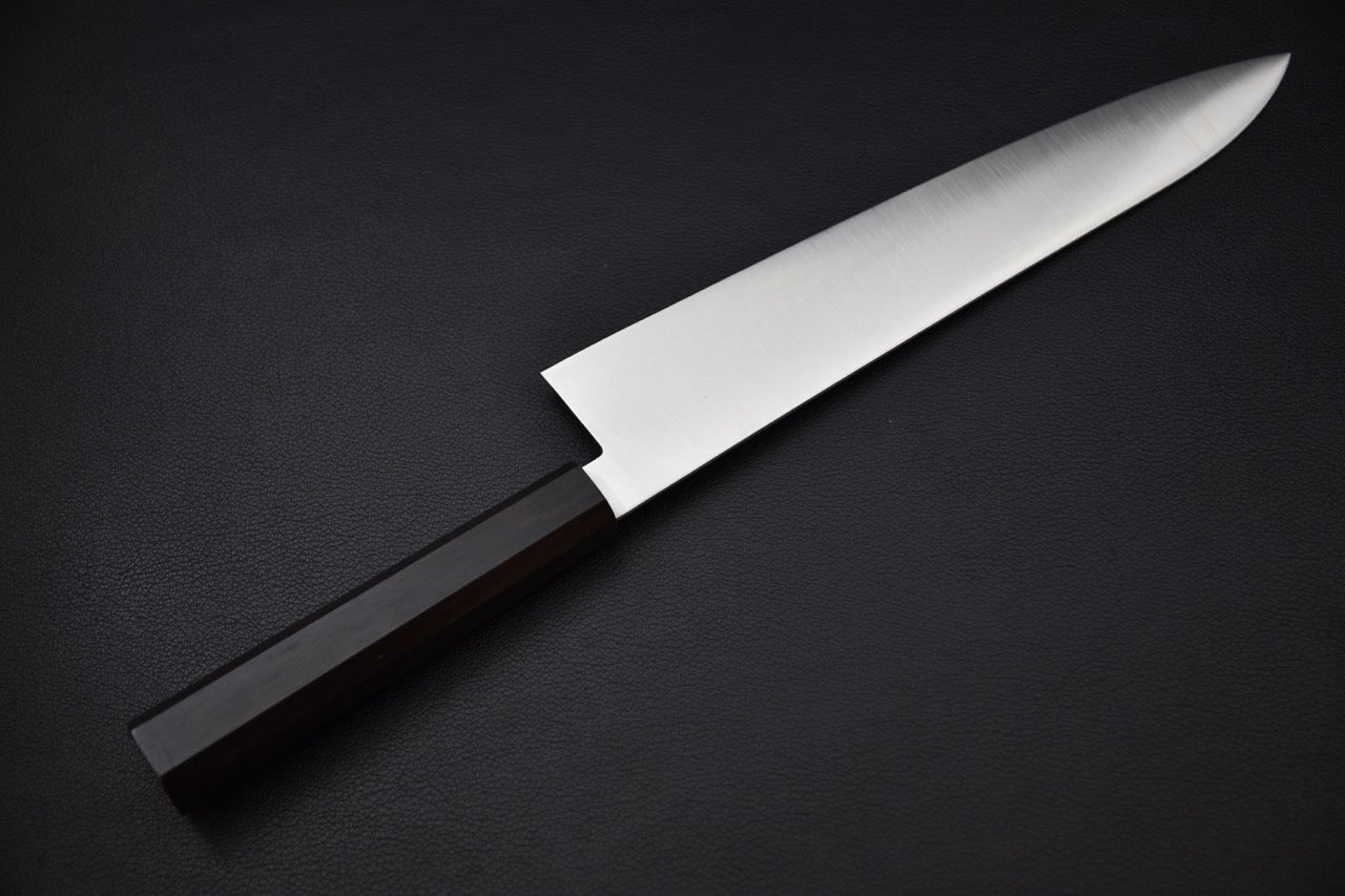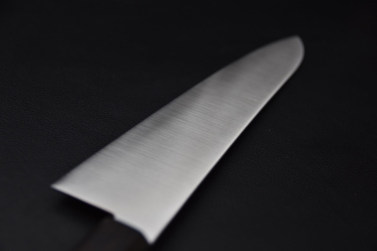 The Gyuto, also known as "牛刀" in Japanese, is a versatile knife that literally translates to "ox sword." It is considered the equivalent of a Western chef's knife and is specially designed to accomplish all kinds of cutting tasks, whether for vegetables, meat, or fish. Featuring a sharp blade and solid construction, the Gyuto is an essential tool for any professional or amateur cook who cares about the precision and quality of their cuts.