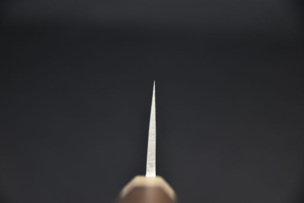 When using the Gyuto, it is crucial to ensure that the blade is perfectly straight upon impact with the cutting board. This helps prevent damage to the knife's edge, ensuring a precise and even cut while preserving the blade's durability. An incorrect impact angle can cause damage to the blade and affect the quality of the cuts. The Gyuto blade is made of high-quality Japanese steel, which gives it exceptional sharpness and high wear resistance. The steels used in the manufacture of Gyuto knives are heat-treated to high levels, allowing them to maintain their edge for a longer period of time compared to other types of knives. To extend the life of the Gyuto and maintain its sharpness, we recommend sharpening it regularly with a quality ceramic steel or using the leather block. As for sharpening on a stone, we recommend doing this once or twice a year for non-professional use. Sharpening on a stone must be done with care and precision, respecting the angle of the blade and following the proper techniques. If you prefer, we can take care of this through our expert sharpening service. If your Gyuto is made from rust-resistant steel, it is essential to take care to clean and dry the blade properly after each use to prevent rust and other moisture-related damage. If your knife is made of stainless steel, we still advise you to take care of it and not put it in the dishwasher, for example.