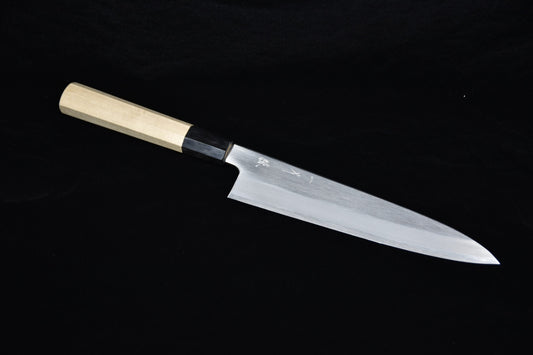 The Japanese word Gyuto (牛刀) literally translates as beef sword. The gyuto is the equivalent of the Western chef's knife and is designed to cut everything: vegetables, meat and fish. It is made to be used with the “push-cut” method, lifting the blade between each cutting movement, or with the pendulum method. It is important that the blade is straight on impact with the cutting board to avoid damage to the knife edge.