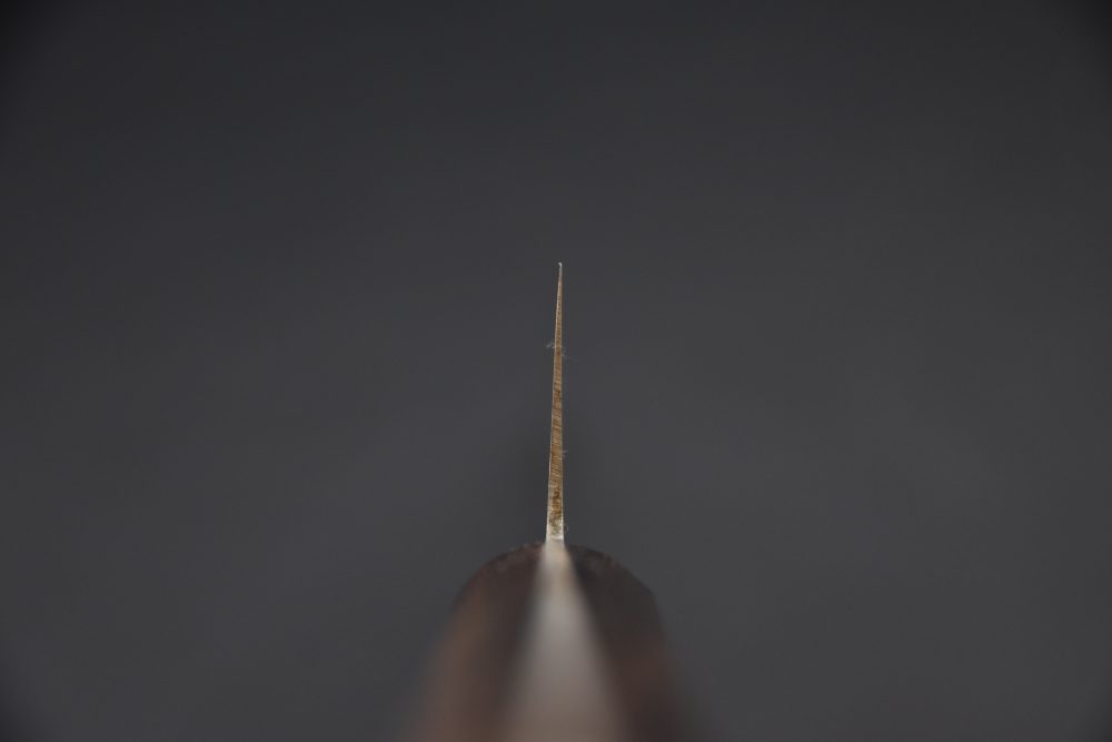 When using the Gyuto, it is crucial to ensure that the blade is perfectly straight upon impact with the cutting board. This helps prevent damage to the knife's edge, ensuring a precise and even cut while preserving the blade's durability. An incorrect impact angle can cause damage to the blade and affect the quality of the cuts. The Gyuto blade is made of high-quality Japanese steel, which gives it exceptional sharpness and high wear resistance. The steels used in the manufacture of Gyuto knives are heat-treated to high levels, allowing them to maintain their edge for a longer period of time compared to other types of knives. To extend the life of the Gyuto and maintain its sharpness, we recommend sharpening it regularly with a quality ceramic steel or using the leather block. As for sharpening on a stone, we recommend doing this once or twice a year for non-professional use. Sharpening on a stone must be done with care and precision, respecting the angle of the blade and following the proper techniques. If you prefer, we can take care of this through our expert sharpening service. If your Gyuto is made from rust-resistant steel, it is essential to take care to clean and dry the blade properly after each use to prevent rust and other moisture-related damage. If your knife is made of stainless steel, we still advise you to take care of it and not put it in the dishwasher, for example.