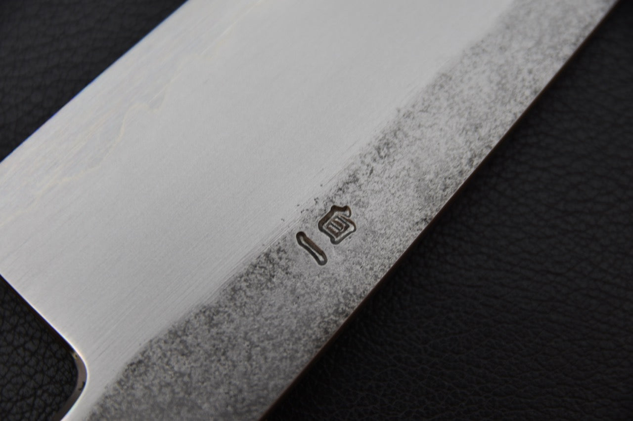 Le manche octogonal en bois sombre équilibre parfaitement l’ensemble, offrant une prise en main sûre et agréable, que vous soyez droitier ou gaucher. Sa légèreté, combinée à un profil nerveux, en fait un compagnon idéal pour les préparations rapides et précises. Ce Ko-Bunka concentre tout l’esprit des couteaux japonais : finesse de coupe, ergonomie étudiée et beauté artisanale.