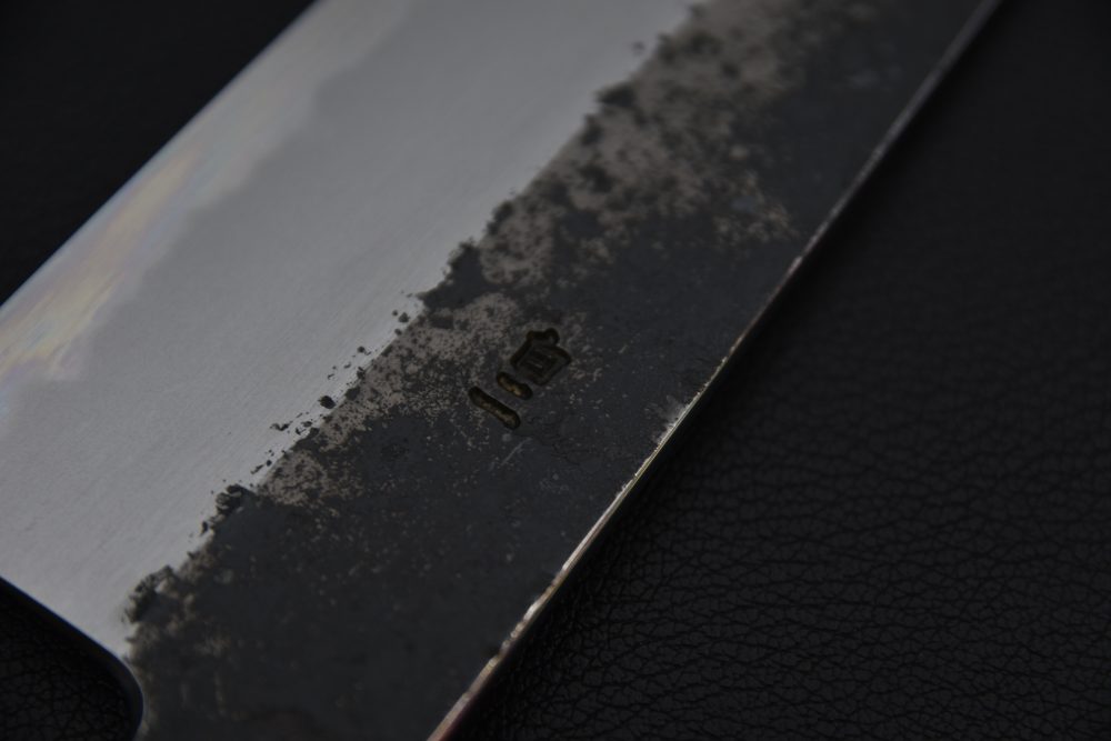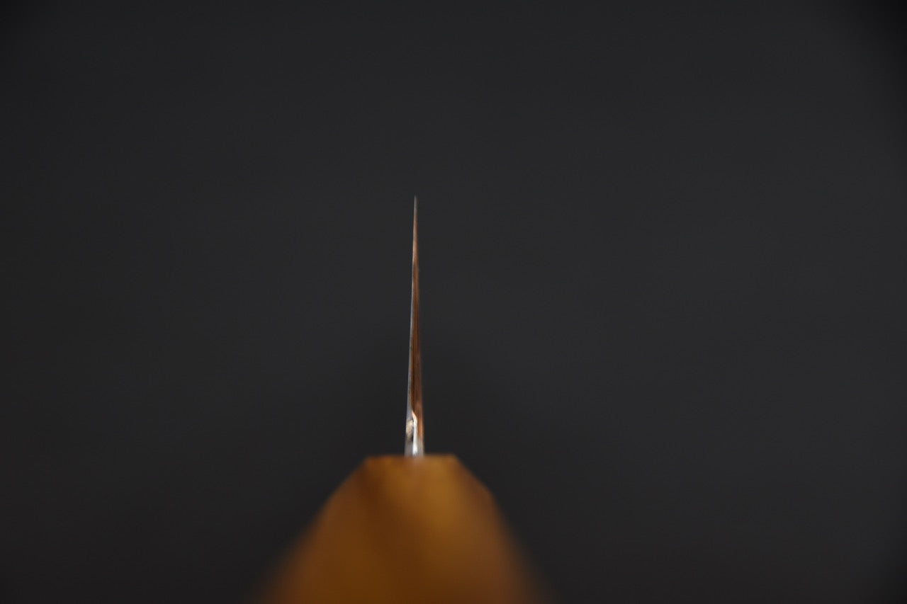 La série Sumi d’Hado est forgée à partir de Shirogami 2(acier blanc numéro 2) par le Maître forgeron Yoshikazu Tanaka et émoulez par Tadataka Maruyama de Fukui Co & Ltd. Recouvert d’acier en fer doux oxydable et arborant un beau finit kurouchi, la série Sumi rejoindra les plus traditionalistes d’entre nous qui pourront apprécier les aspects d’une lame complètement carbone. Construit avec une hauteur de lame plus élevée, la série Sumi se démarque des autres séries d’Hado. Couplez à l’émoulage concave de Tadataka qui donne un tranchant très mince, on peut qualifier ces lames de laser. Nous recommandons cette série aux cuisiniers professionnels ayant une bonne expérience des lames qui sont complètement carbones, aux adeptes de couteaux japonais traditionnels et à tous ceux qui sont prêts à faire le saut dans le monde des couteaux en carbone.