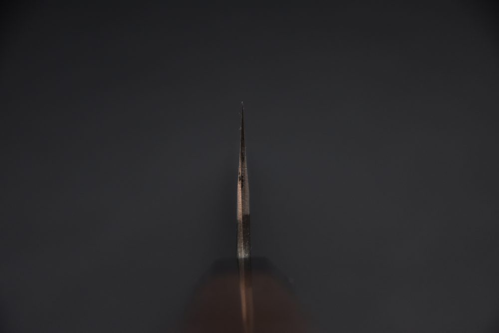 Lors de l'utilisation du Gyuto, il est crucial de veiller à ce que la lame soit parfaitement droite au moment de l'impact avec la planche à découper. Cela permet d'éviter d'endommager le tranchant du couteau, en assurant une coupe précise et uniforme tout en préservant la durabilité de la lame. Un mauvais angle d'impact peut entraîner des dommages à la lame et affecter la qualité des coupes. La lame du Gyuto est conçue en acier japonais de haute qualité, ce qui lui confère un tranchant exceptionnel et une grande résistance à l'usure. Les aciers utilisés dans la fabrication des Gyuto sont traités thermiquement à des niveaux élevés, ce qui leur permet de maintenir leur tranchant pendant une période plus longue par rapport à d'autres types de couteaux. Pour prolonger la durée de vie du Gyuto et maintenir son tranchant, nous recommandons de l’affûter régulièrement avec un fusil en céramique de qualité ou en utilisant le bloc de cuir. Pour ce qui est de l'aiguisage sur pierre, nous recommandons de le faire une ou deux fois par années pour une utilisation non professionnelle. L’aiguisage sur pierre doit être fait avec soin et précision, en respectant l'angle de la lame et en suivant les techniques appropriées. Si vous voulez, on s’en occupe via notre service d’aiguisage expert. Si votre Gyuto est fabriqué à partir d’acier oxydable, il est essentiel de prendre soin de nettoyer et de sécher correctement la lame après chaque utilisation, afin de prévenir la formation de rouille et d'autres dommages liés à l'humidité. Dans le cas où votre couteau est fait d’acier inoxydable, on vous conseille tout de même de prendre soin de celui-ci et de ne pas le mettre au lave-vaisselle par exemple.