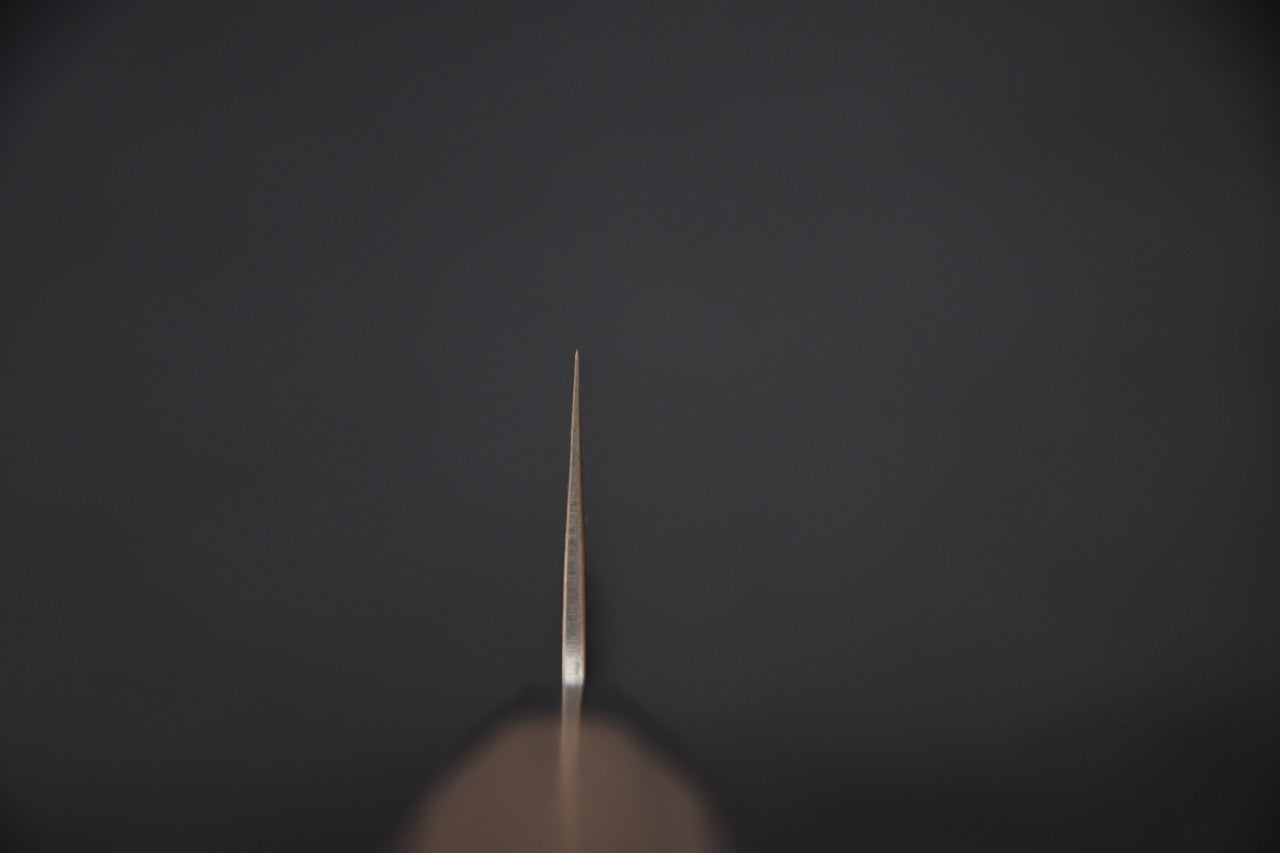 Le Shirogami #1 par Hitachi steel co se traduit par acier blanc #1 et est une version améliorée du Shirogami #2 car il contient un taux de carbone plus élevé. Il tient sa dénomination en référence à la couleur du papier dans lequel il est emballé une fois produit. Il est considéré comme un des aciers les plus purs, après le Tamahagane, ce qui permet d’obtenir un tranchant plus incisif que la plupart des autres aciers. Cependant, il sera généralement plus fragile et peut briser plus facilement par suite d’une mauvaise utilisation. Maîtriser la forge du shirogami #1 pour exploiter son plein potentiel n’est pas simple et demande une expertise que peu de forgerons détiennent. C’est dans le processus de fabrication d’un couteau de type Mizu Honyaki que vous retrouverez le shirogami #1 sous sa version la plus difficile a forgée, mais aussi la plus tranchante.