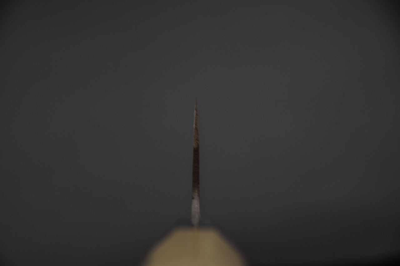Le manche octogonal en bois de ho (magnolia japonais), terminé par une virole en corne de buffle noire, procure une prise en main légère et confortable, parfaitement adaptée aux longues sessions de préparation. Sa texture naturelle et son poids plume renforcent la sensation de contrôle et d’agilité. Ce couteau a été pensé pour les cuisiniers passionnés qui cherchent un outil expressif, à la fois traditionnel dans son esprit et tranchant dans son efficacité.