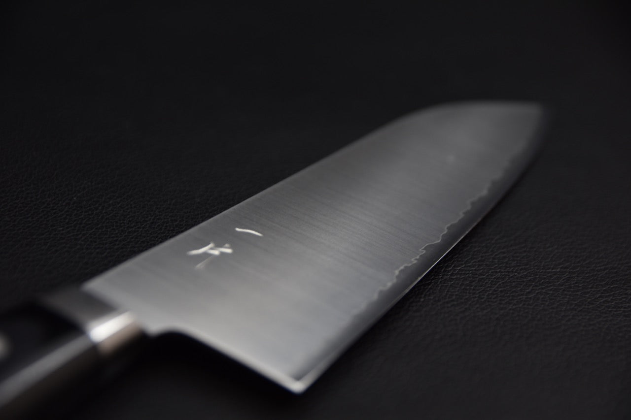 Le couteau Santoku, ou encore Santoku bōchō, est un couteau japonais Santoku polyvalent d'origine japonaise. Son nom signifie littéralement "trois vertus" ou "trois utilisations" en japonais. Mesurant généralement entre 15 et 18 cm de long (6 et 7 pouces), sa lame possède un tranchant plat et une pointe incurvée en kamagata formant un angle d'environ 60 degrés. Le terme "Santoku" fait référence à la grande variété d'ingrédients que ce couteau Santoku peut couper, tels que la viande, le poisson et les légumes, ainsi qu'aux tâches qu'il peut accomplir, comme tranchée, hacher et émincer. Ces deux interprétations soulignent l'aspect multi-usage et polyvalent de ce couteau japonais Santoku de cuisine.
