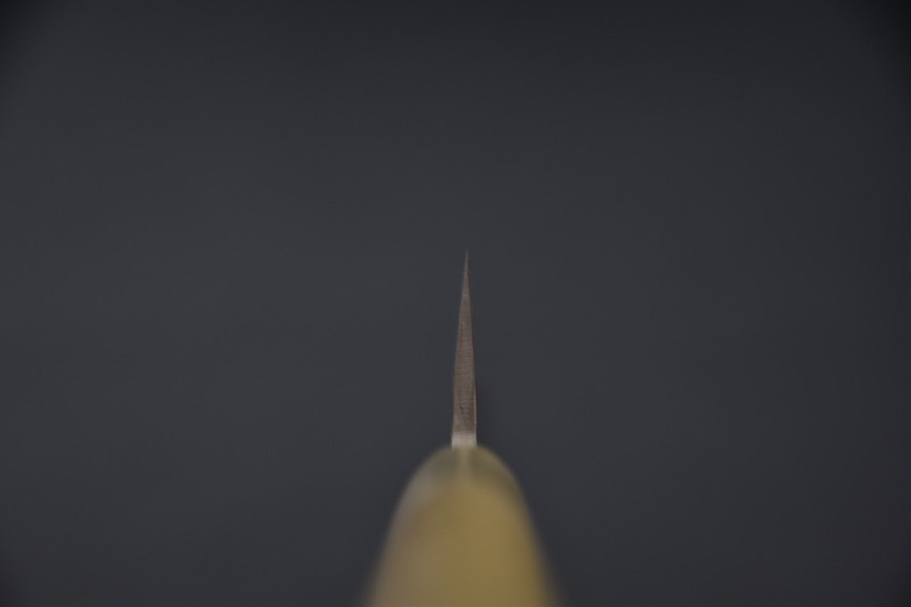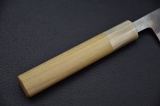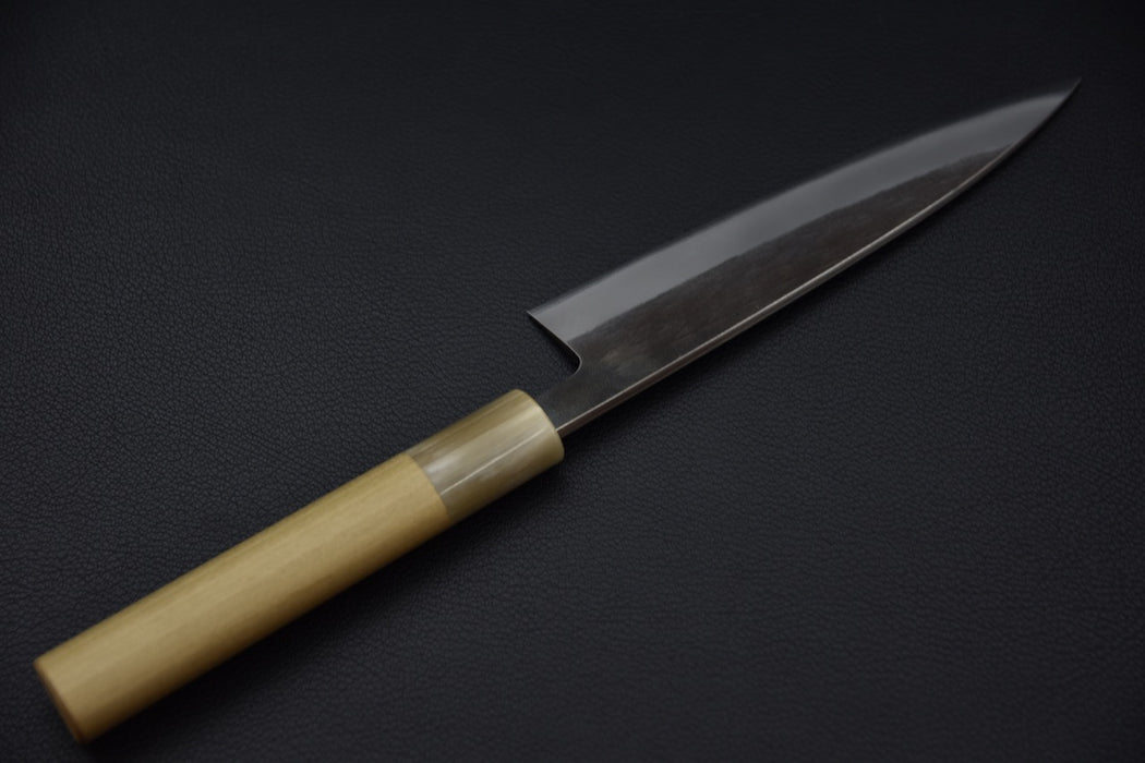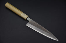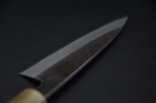 Ce Petty 150 mm Hitohira TD incarne l’excellence artisanale de Sanjo. Forgé dans un acier Aogami #2 (Blue Steel #2) réputé pour son excellent équilibre entre rétention du fil et facilité d’aiguisage, il est ici enveloppé d’un revêtement en acier inoxydable, ce qui réduit significativement les risques de corrosion tout en gardant les performances d’un acier carbone au cœur.