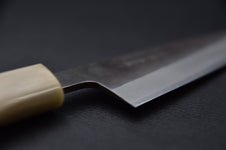 Sa finition kurouchi, brute de forge, apporte une belle touche rustique et aide à protéger la lame contre l’oxydation. Cette esthétique sombre contraste élégamment avec le poli brillant de la partie inférieure de la lame, révélant une ligne de forge sobre et authentique.