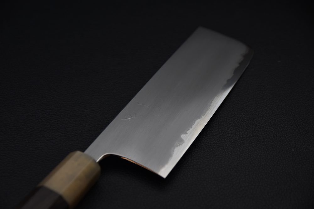 Le Shirogami #1 par Hitachi steel co se traduit par acier blanc #1 et est une version améliorée du Shirogami #2 car il contient un taux de carbone plus élevé. Il tient sa dénomination en référence à la couleur du papier dans lequel il est emballé une fois produit. Il est considéré comme un des aciers les plus purs, après le Tamahagane, ce qui permet d’obtenir un tranchant plus incisif que la plupart des autres aciers. Cependant, il sera généralement plus fragile et peut briser plus facilement par suite d’une mauvaise utilisation. Maîtriser la forge du shirogami #1 pour exploiter son plein potentiel n’est pas simple et demande une expertise que peu de forgerons détiennent. C’est dans le processus de fabrication d’un couteau de type Mizu Honyaki que vous retrouverez le shirogami #1 sous sa version la plus difficile a forgée, mais aussi la plus tranchante.
