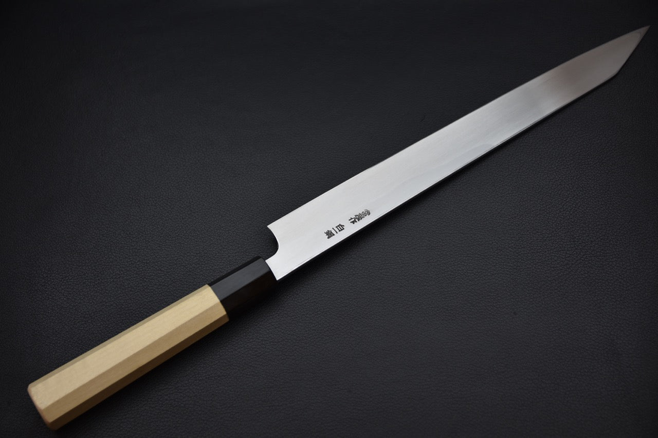 Plongez dans une expérience de découpe raffinée avec ce couteau japonais d’exception, alliant puissance et légèreté. La lame en acier carboné Shirogami #1 offre une douceur de coupe surprenante : chaque tranche glisse avec précision, sans effort. Le profil kiritsuke yanagiba de 300 mm, conçu pour les sashimis ou les poissons entiers, allie maîtrise et élégance.