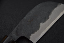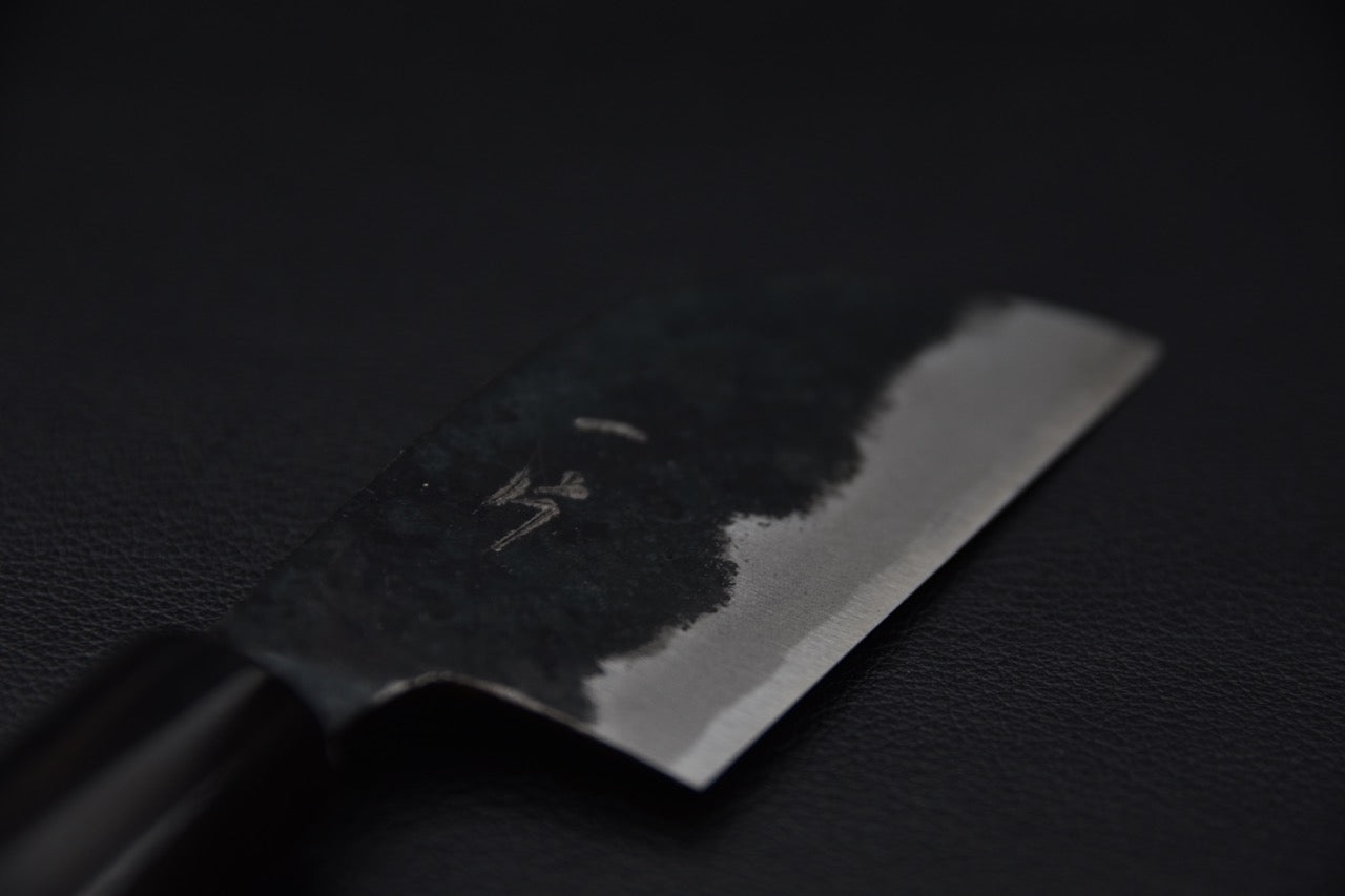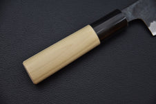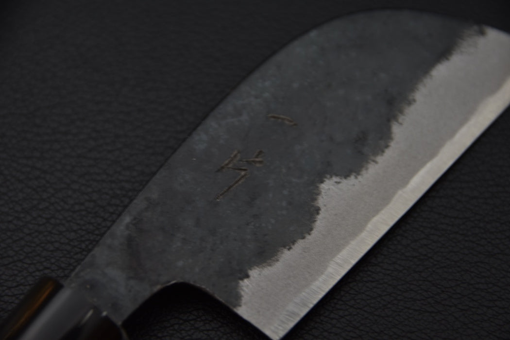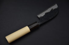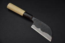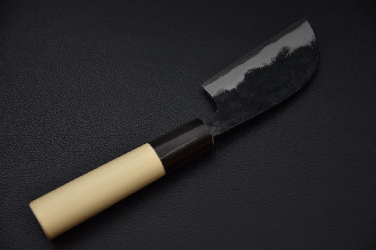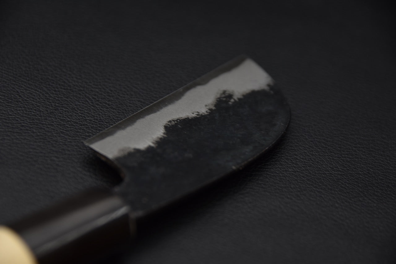 Ce petit couteau japonais de type paring (ou office) est un allié polyvalent pour les travaux de précision en cuisine. Sa courte lame de 80 mm est forgée à la main dans la région de Tosa, une région réputée pour son savoir-faire ancestral. On y retrouve une finition Kurouchi brute de forge, témoin de la tradition artisanale, contrastée par un tranchant poli rasoir qui révèle la finesse de l’acier Shirogami #2 (White #2).