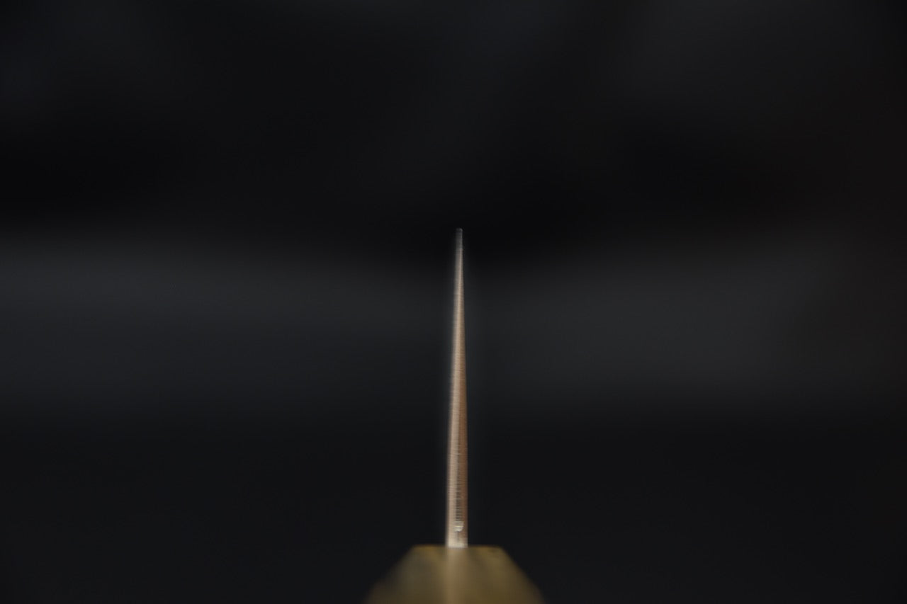 Le meilleur couteau Bunka se reconnaît immédiatement à sa pointe angulaire marquée (k-tip). Cette géométrie particulière permet des découpes de précision, notamment pour tailler les légumes, retirer les membranes, ou travailler près des os avec contrôle. Contrairement aux couteaux à lame arrondie conçus pour le mouvement de balancier, le Bunka privilégie des gestes fluides et contrôlés, de haut en bas, en tirant vers soi ou en poussant.