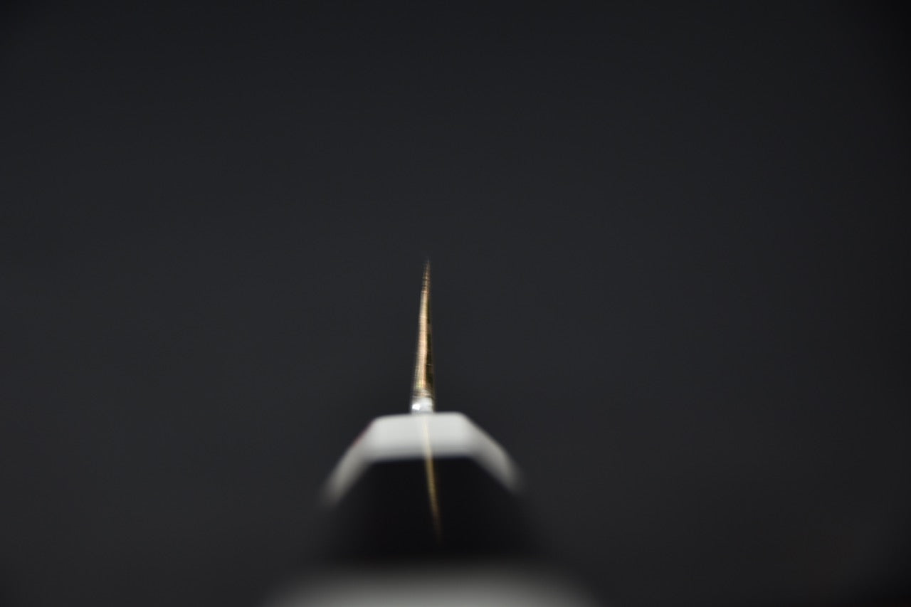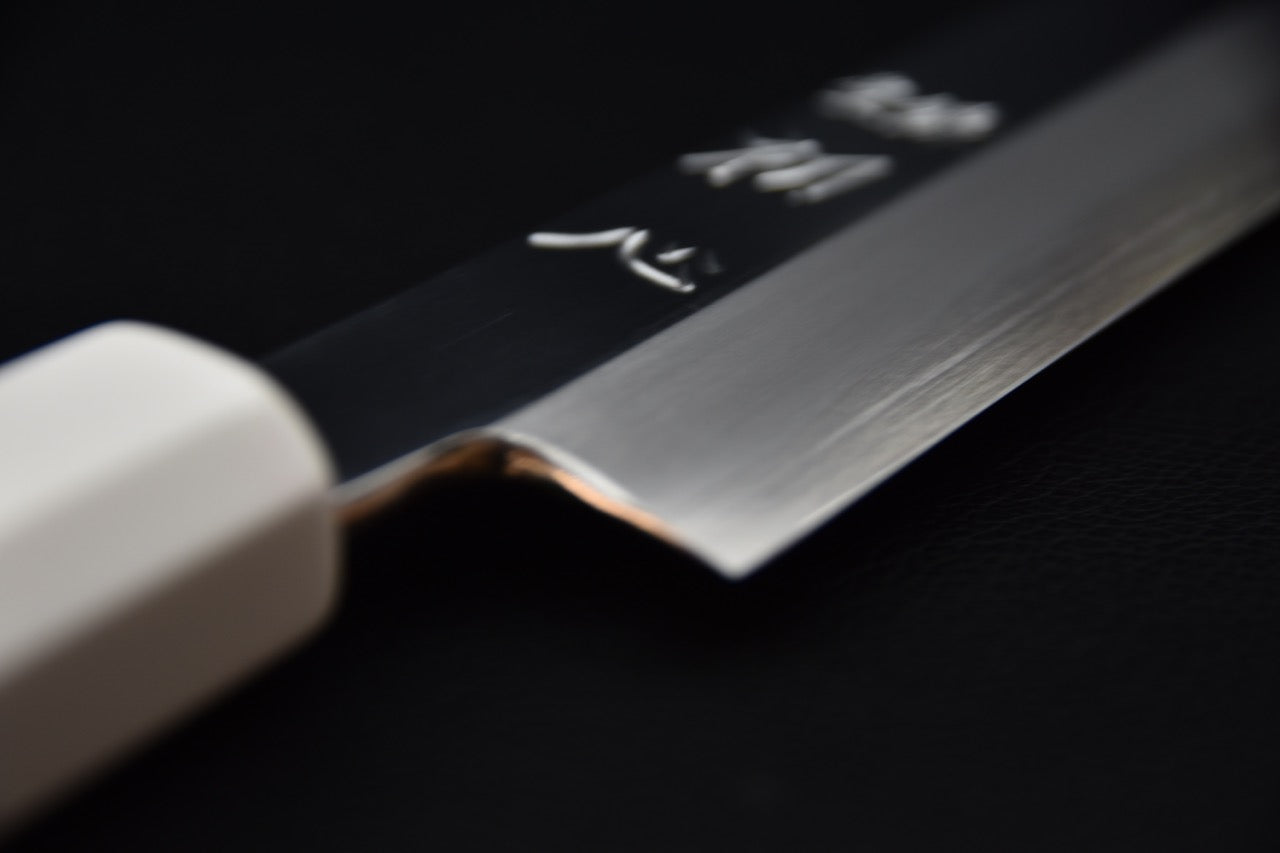 Yanagiba se traduit par « lame de saule » puisque la forme de sa lame étroite, longue et incurvée sur la partie arrière ressemble à une feuille de saule. La spécialité du Yanagiba est la tranche de poisson de façon précise et nette pour la coupe de sashimi ou de nigiri par exemple. Il peut aussi être utilisé pour lever les filets de certains poissons et trancher de la viande. Le tranchant très fin peut être endommagé facilement. On vous conseille donc de faire attention avec les arêtes et les os. L’arrière du couteau (urusaki) concave crée un trou d’air entre la chair du poisson et la lame, permettant de facilement détacher la lame de la chair du poisson, alors que le biseau sur la face du couteau (shinogi) permet de facilement détacher la pièce de poisson qu’on tranche. Le Yanagiba se retrouve généralement entre 210 mm et 330 mm.